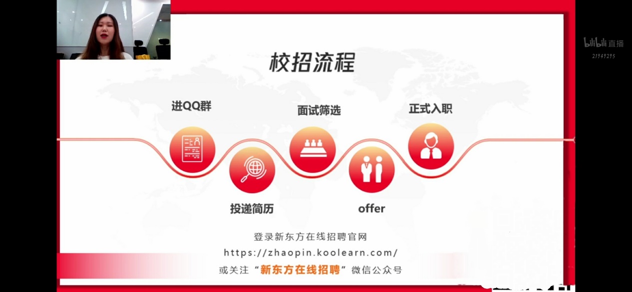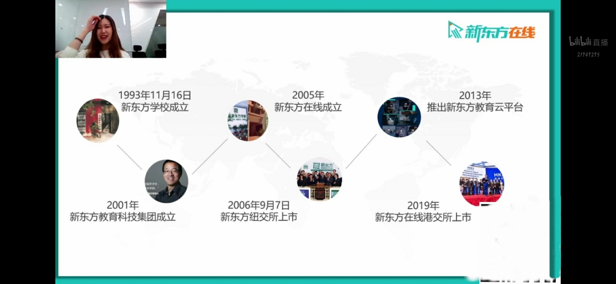 招聘会开始,主播小姐姐为直播间的同学们介绍了新东方在线教育的发展史与教育服务品类。