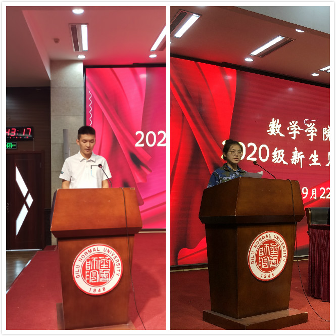 会议开始,2020级数学与应用数学专业(公费师范生)史恬瑜同学代表新生发言。她表示,站在人生的新起点上,应当对自己提出更高要求,秉持“博学明道 崇德象贤”的校训,努力提升自身的学术水平和道德素养,做好学业规划,不断探索前行。老生代表刘锦鹏同学向学弟学妹们讲述了自己在校生活的感悟,强调了大学环境里的机遇与挑战,激励大家用勤奋书写青春,让知识改变命运。