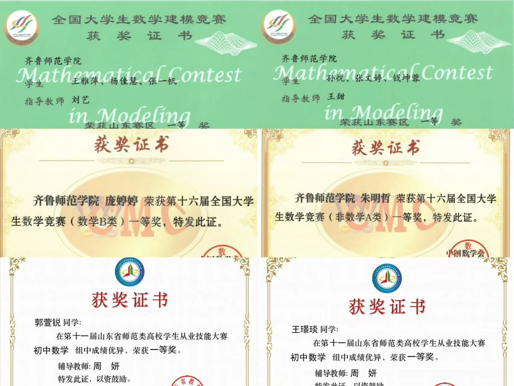 近年来,学生在山东省师范类高校学生从业技能大赛中获得省级一等奖10项,二等奖13项,三等奖14项,在全国大学生数学建模竞赛、全国大学生数学竞赛等比赛中获得国家级奖励90余项,省级奖 130余项。近年来,学生平均考研率17.3%,部分学生考取吉林大学、中国矿业大学(北京)、中国石油大学(华东)、中国地质大学(北京)、陕西师范大学、太原理工大学、河海大学、河北工业大学、江苏大学、四川师范大学等知名高校的研究生。