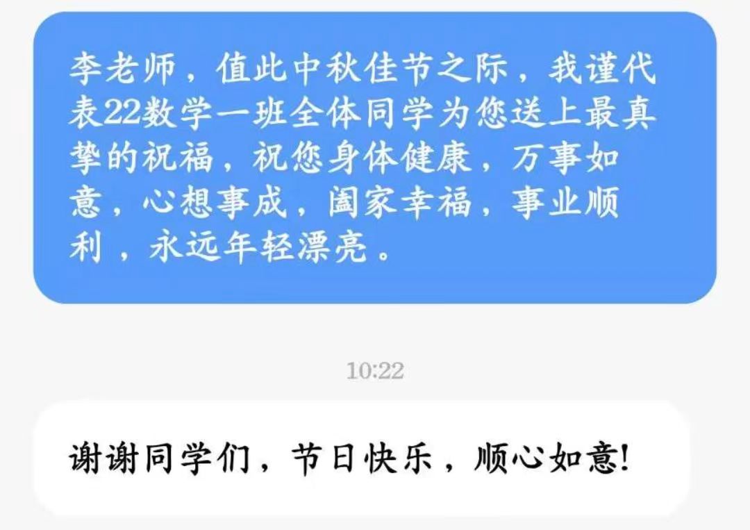短信蕴长情,佳节送温情。我院学生通过为老师发送短信祝福语,让老师感受到了来自同学们的温暖,一条条温馨的祝福语中饱含的是同学们对老师真挚的感谢和敬意,使广大学生对老师多了份理解和尊重,此次活动还深化了当代大学生的感恩意识,对于促进我校的精神文明建设有着积极意义。