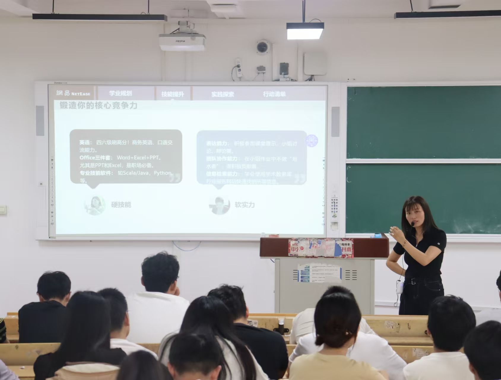 此次主题班会的成功举办,不仅为学生提供了专业的规划思路与实用方法,也搭建了学院与企业协同育人的桥梁,为我院学子的成长成才注入了新动力。未来,我院将与网易有道持续开展更多富有创新性和实用性的讲座及实践活动,进一步打通“学院育人”与“企业资源”的衔接通道,为我院学子搭建更广阔的成长平台,助力每一位学生在学业与职业道路上稳步前行。