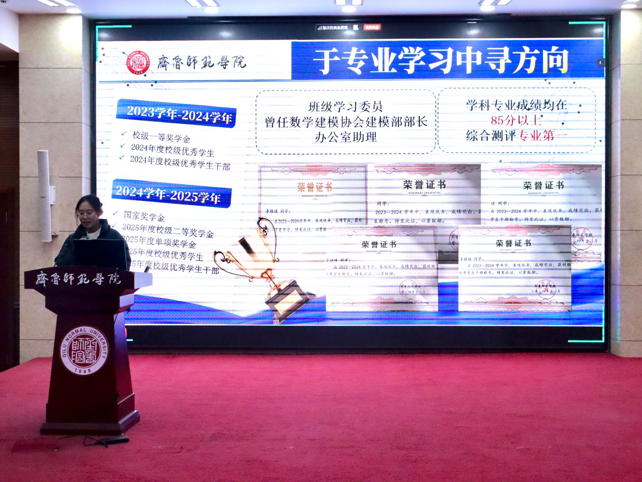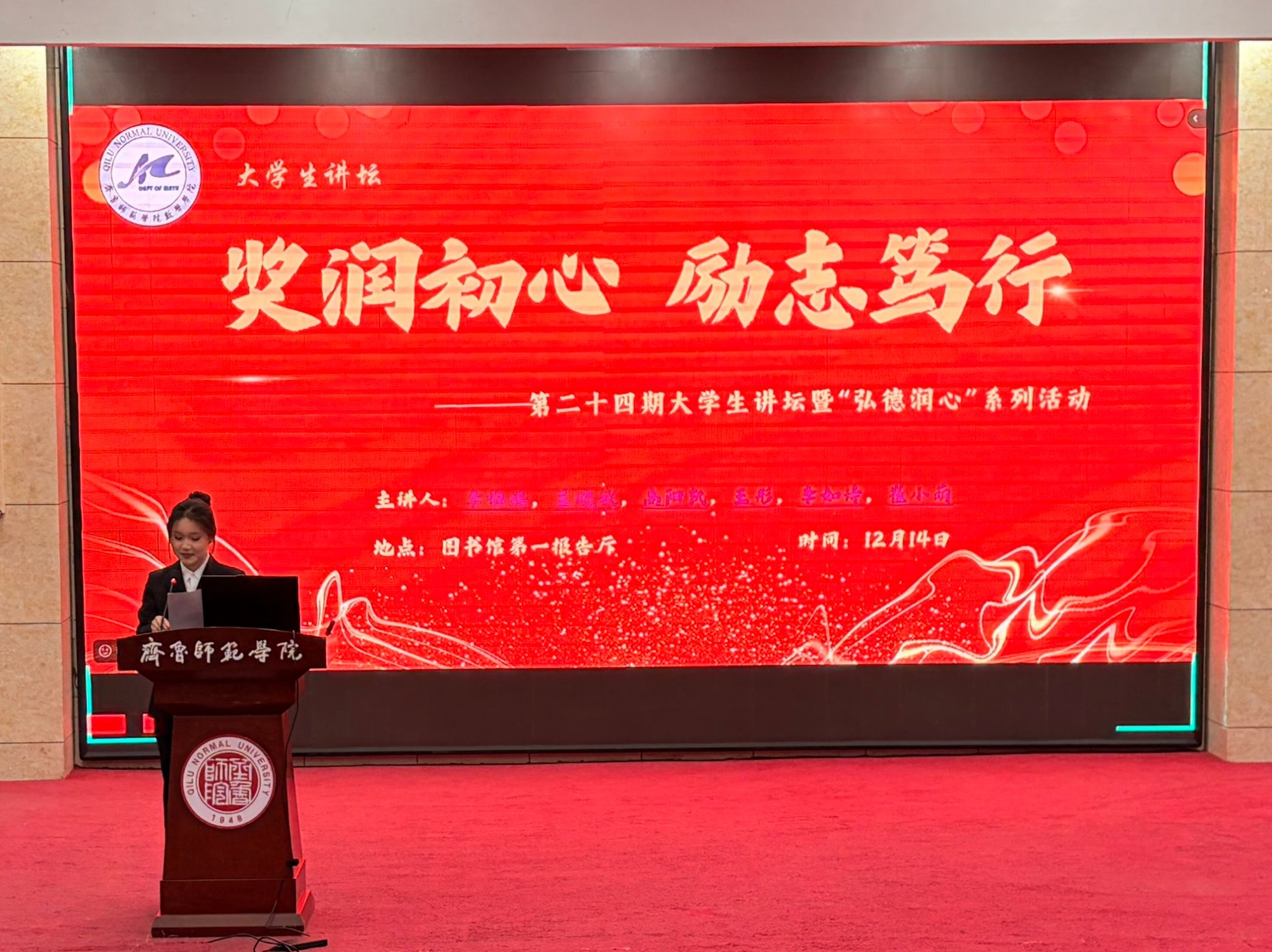 为深化资助政策育人效能,助力青年学子逐梦青春、励志笃行,筑牢成长根基,yl7703永利集团于12月14日晚在第一学术报告厅隆重举行“奖润初心 励志笃行”——第二十四期大学生讲坛暨“弘德润心”系列活动。六位斩获各类奖学金的优秀学子受邀登台分享成长心得,其中国家奖学金获得者李雅琪、王晓敏,省政府奖学金获得者高阳凯,校长奖学金获得者崔小萌,以及国家励志奖学金获得者王彤、李如诗,用自身经历传递奋进力量。2025级全体同学齐聚一堂,共赴这场干货满满的成长之约。