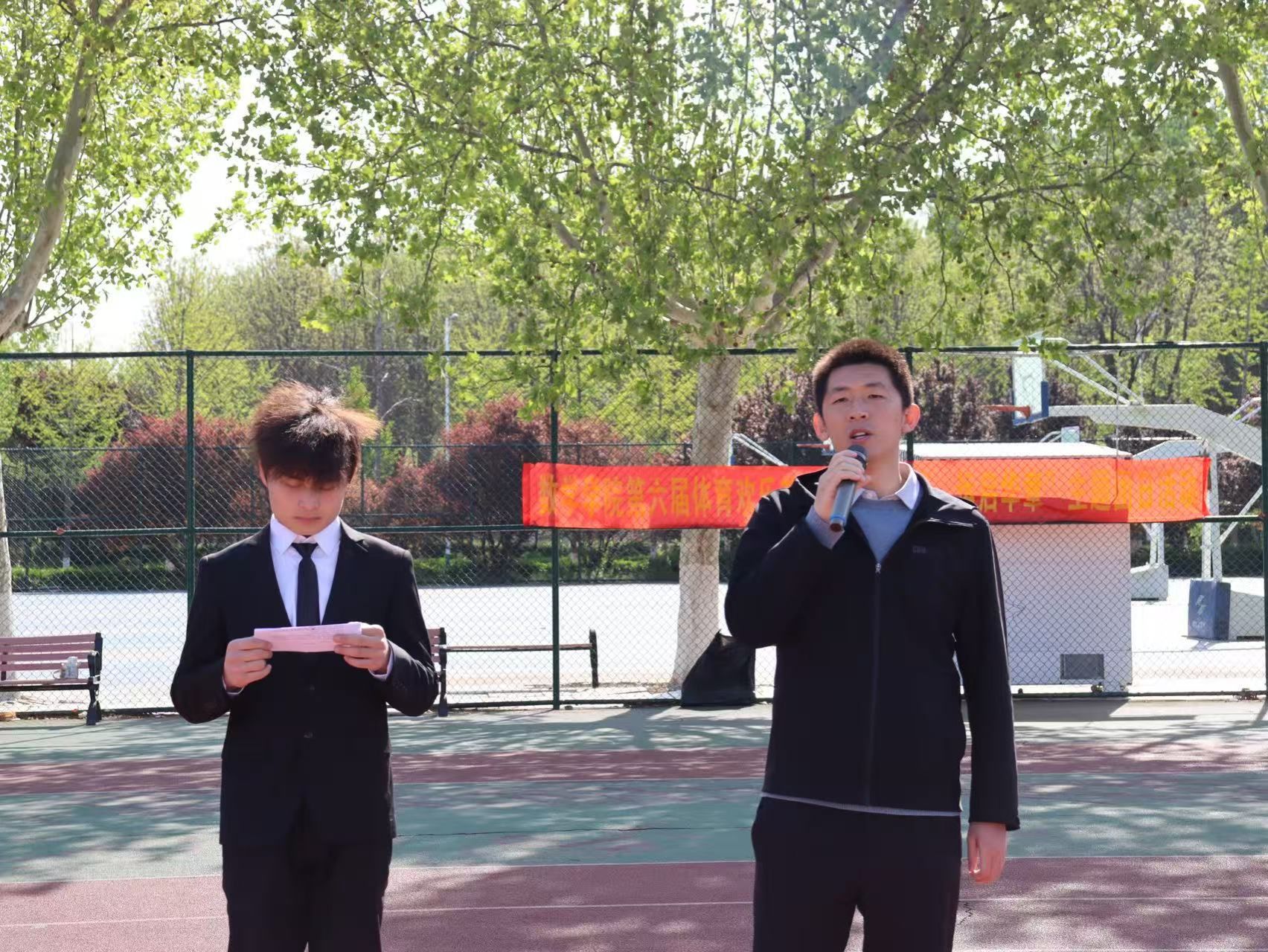随后,运动员代表董政辉发言,表达了积极参与赛事、奋勇争先的坚定决心。高玉喜代表全体志愿者庄严宣誓,承诺恪尽职守、全力做好各项服务保障工作。王政文在总结讲话中勉励同学们加强体育锻炼、增强安全防护意识,并宣布本届体育欢乐节正式开幕。