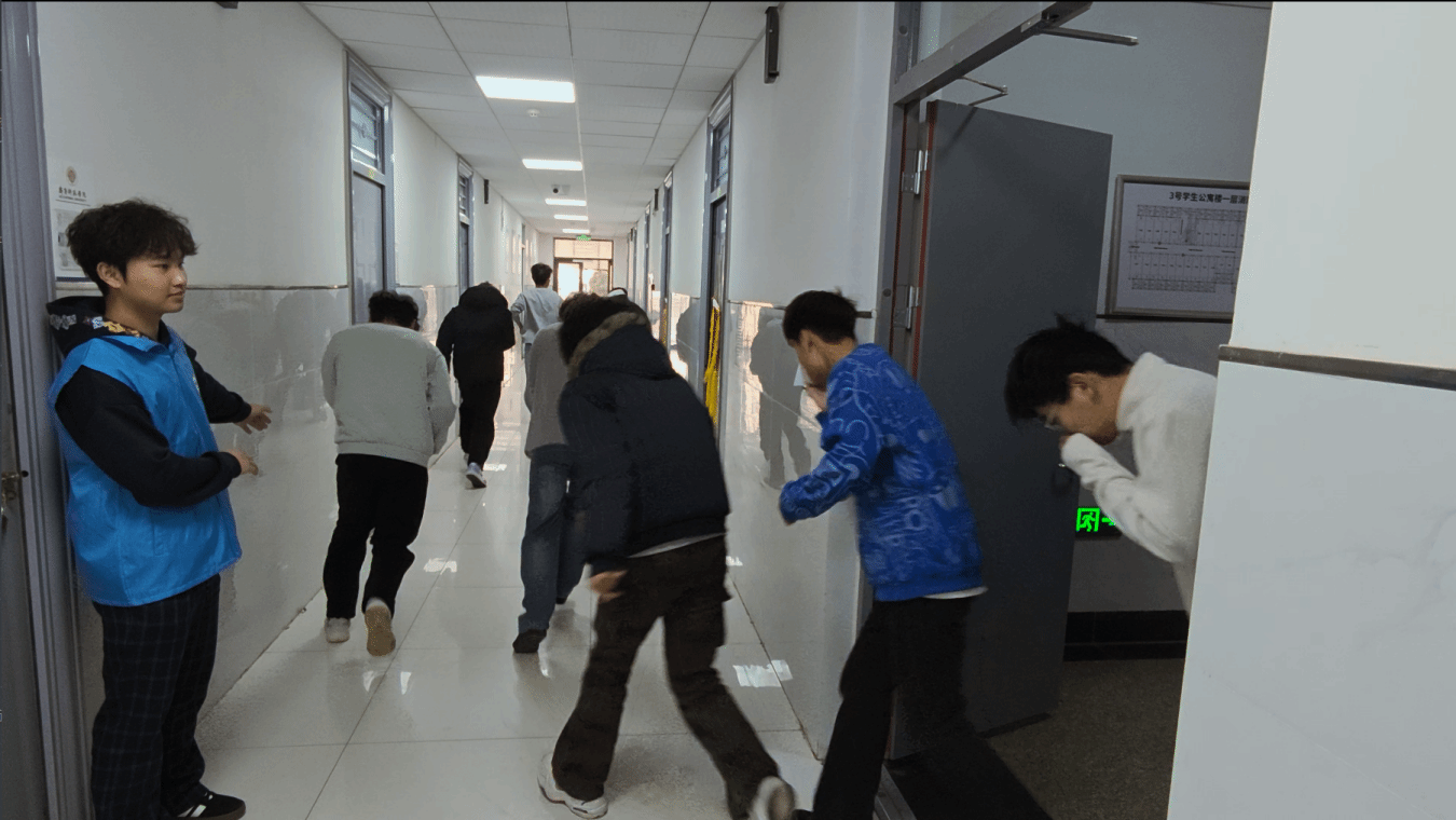 在实操演练环节中,学院以宿舍为场景开展火场逃生演练,警报声响起后,学生们弯腰低姿、捂住口鼻,按照预设路线快速有序撤离,整个过程紧张有序、有条不紊。同学们沉着冷静,互相提醒,不推不挤,展现了良好的应急素养和团队协作精神。从警报响起到全院学生安全撤离至楼下指定集合点,演练全程高效、安全,不仅有效检验了我院的应急疏散预案,更让学生们在实战中掌握了宝贵的逃生技能。