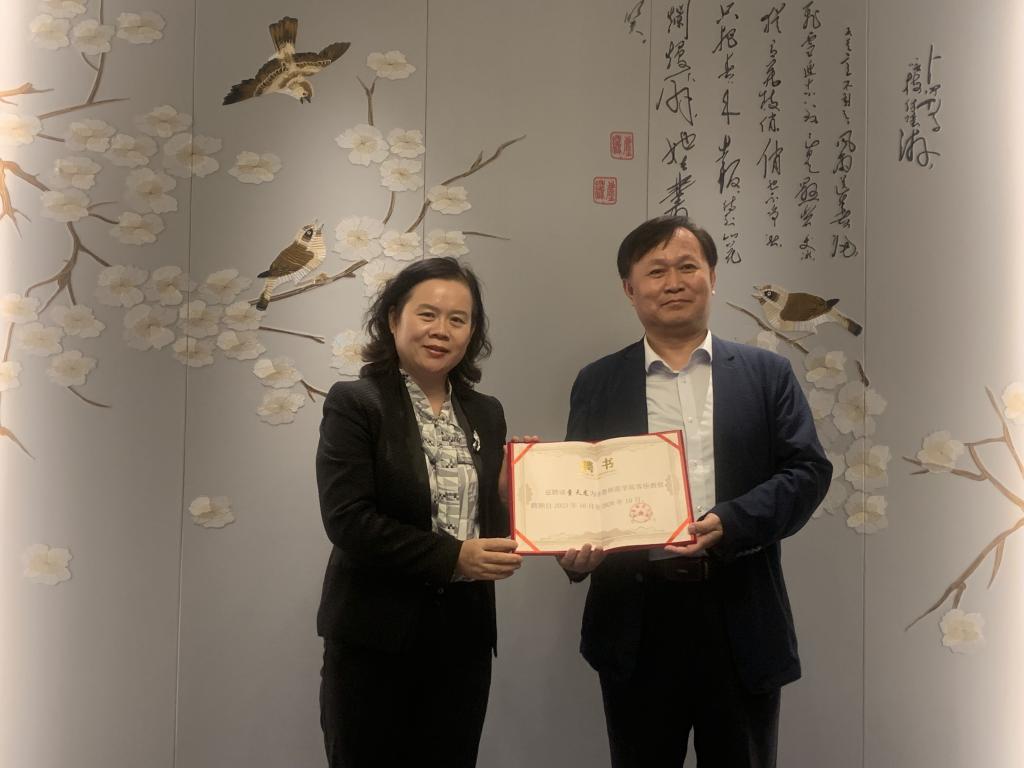 赵敏代表学校为董天龙老师颁发聘书。她表示,董天龙教授在基础教育领域的研究成果丰硕,聘请其为客座教授,可以弥补yl7703永利集团在基础教育研究领域的缺失,对加强基础教育和高校之间的课题研究、学科建设指导以及师范生培养等都有着强有力的推动作用。