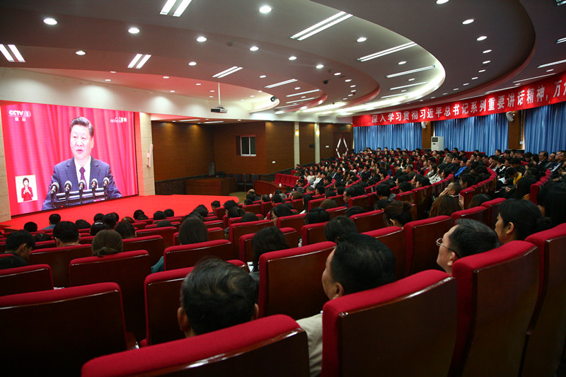 王玉华书记强调,近期全校上下要把学习宣传贯彻党的十九大精神、学习贯彻习近平总书记所作的十九大报告作为首要政治任务抓紧抓好,把全校师生员工的思想统一到十九大精神上来,把力量凝聚到实现十九大确定的各项任务上来。他提出三点要求,一要在十九大召开期间认真组织收听收看,第一时间学习领会会议精神。各部门单位一把手要切实负起政治责任,抓好本部门单位学习工作,确保全员学习,学深学透,学出成效。二要认真组织学习研讨,以党的十九大精神为指引,坚持理论联系实际,针对学校事业发展实际深入思考,举行十九大报告专题研究,写出学习汇报文章,在学校网站或校报进行刊登。三要坚持学以致用、用以促学,用党的十九大精神统一思想、凝聚力量,立足本职岗位,扎实做好本职工作,把党的十九大精神体现到做好学校各项工作任务。