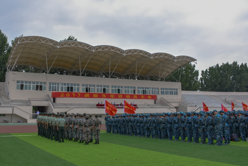 军列阵阵、红旗飘扬。9月4日下午,我校在章丘校区运动场举行了隆重的2017级新生军训动员大会。学校宣传部、教务处、学生工作处、保卫处、团委等部门负责人,各学院党总支书记(副书记)、团总支书记(副书记)、全体辅导、军训全体教官和2017级新生参加了动员大会。副校长王海、 32125部队首长到会并讲话。