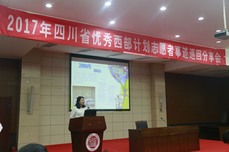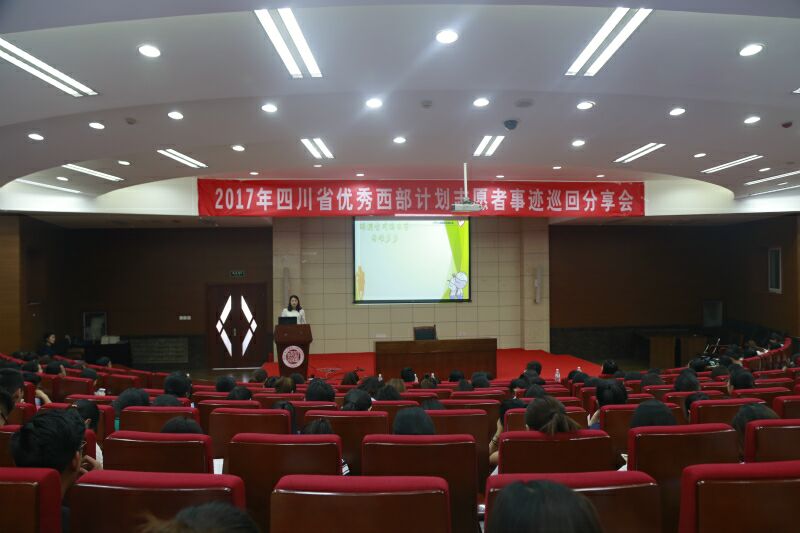 宣讲会在一段宣传片中展开,宣传片以志愿者故事为原型,通过微电影的形式,向大家展示了西部计划志愿者在基层成长成才、干事创业、建功立业的感人故事。紧接着,宣讲团成员吴丹、张赟、石凯丽分别向大家讲述了他们的志愿经历。他们对四川省的自然风光、人文环境、社会治安和经济状况做了详细的介绍,同时,他们用朴实的语言、深刻的感悟、真挚的感情和饱满的热情讲述了他们志愿服务西部、服务四川建设的感人事迹。三位优秀的志愿者,三段不同的感人故事,三个同样铁宕起伏的人生,他们用奋斗的青春深刻诠释了“奉献、友爱、互助、进步”的志愿者精神,他们把自我价值实现和社会价值实现相结合,把个人前途和祖国命运相结合,真正做到在实践中“受教育、长才干、做贡献”。他们的经历深深打动了在场的每一个人,全场响起一次又一次热烈的掌声。