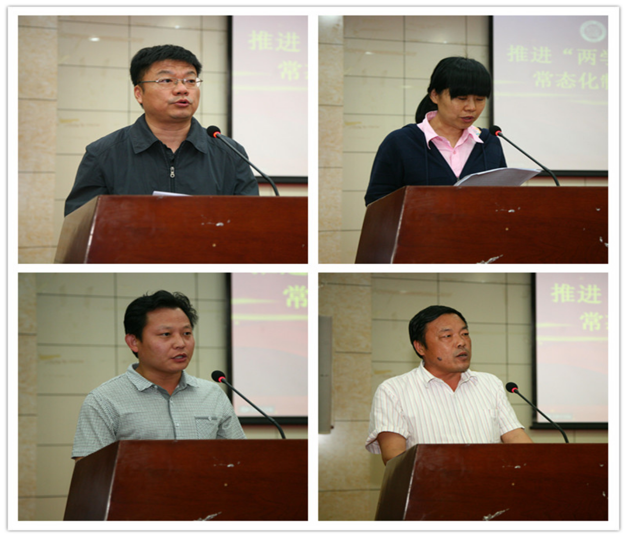 林松柏同志就落实会议情况,强调了四点意见。一要抓好会议精神的传达学习。各级党组织要利用召开党总支会、支委会、党员大会等时机,认真学习领会习近平总书记重要指示精神、省委领导讲话主要精神和王玉华同志的讲话,深刻认识推进“两学一做”学习教育常态化制度化的重大意义,不断提高推进“两学一做”学习教育常态化制度化的思想自觉、政治自觉和行动自觉。二要结合本单位实际细致谋划。下一步,各级党组织要根据学校《推进“两学一做”学习教育常态化制度化的实施方案》要求,对本单位本部门推进“两学一做”学习教育常态化制度化作出安排。要细化学习内容,对集体学习、个人自学内容作出具体要求;要创新活动形式,以创新性实践活动深化学习教育成效;要落实学习登记、发言交流、撰写心得体会等制度,保证全体党员参与学习教育的积极性。三要不断浓厚学习教育氛围。各级党组织要充分利用《学院报》、校园网、宣传栏、板报横幅等宣传媒体,大力宣传上级和学校关于推进学习教育常态化制度化的部署要求,扩大推进学习教育常态化制度化的覆盖面和影响力。要及时总结推广“两学一做”学习教育中涌现出的先进典型和事迹,进一步营造推进学习教育常态化制度化的良好氛围。四要坚持求真务实的工作作风。各级党组织要牢固树立抓好党建是最大政绩的理念,进一步增强责任感使命感,严格责任落实,做好统筹兼顾;要始终保持良好的精神状态和务实的工作作风,善始善终,善作善成,以钉钉子的精神推动各项工作任务落到实处、见到实效;要紧紧围绕学校中心任务,抓好工作、带好队伍、推动发展、维护稳定、促进和谐,不断增强党组织的创造力凝聚力战斗力,为本科教学工作合格评估作出新贡献,推动“两学一做”学习教育常态化制度化取得扎实成效。