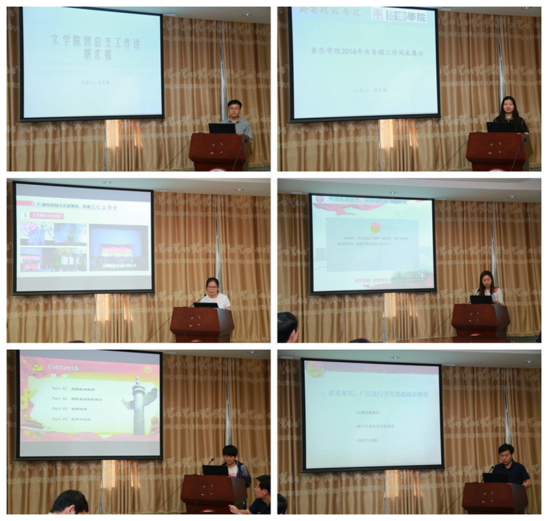 本次考核以《2016年山东省共青团学校工作要点》和2016年我校学生处、团委工作要点为依据,参照《山东省高校共青团工作考核细则》的相关标准,结合我校实际,本着“突出重点、激励创新;实事求是、公平公正;便于操作、易于考核”的原则,采取项目工作与现场述职相结合的方式进行。在汇报会上,各学院团总支从组织建设、宣传工作、思想引领、校园文化、社团活动、学风建设、创新创业、社会实践、志愿服务等方面汇报展示了各自的工作特色和品牌亮点,思路清晰、内容凝练、案例丰富。最后,教师教育学院、音乐学院、经济与管理学院、马克思主义学院荣获