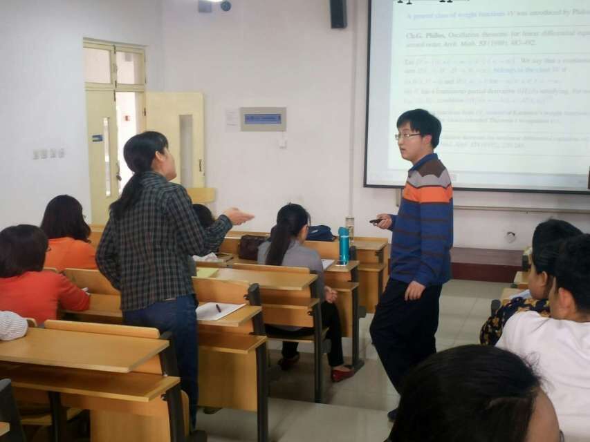 第一场报告由非线性分析研究所所长王建国教授主持。报告中,李同兴教授对带阻尼项的非线性微分方程的振动性研究情况从起源到最新成果进行了全面的梳理,介绍了该研究课题的主要研究方法、使用的数学工具,提出了下一步的研究方向和猜想,与参会教师进行了学术探讨,达到了启发思想、学术交流和营造学术氛围的目的。