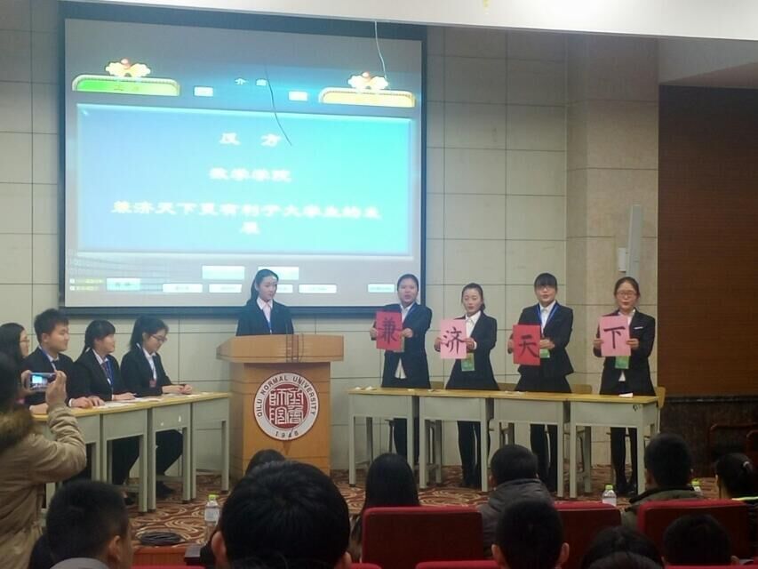 此次辩论赛的辩题是:独善其身和兼济天下哪一个更有利于大学生的发展。首先由纵横辩论社学习部负责人进行背景介绍,随之而来的就是激烈的对决。经过开篇陈词,攻辩,攻辩小结,自由辩论和总结陈词,一场没有硝烟的文学战争激烈地上演着。辩手们言辞犀利,思维敏捷,语出惊人。在不失庄重,严肃的辩论规则下,幽默的连珠语言总能调动起全场观众的气氛,引起观众们一次又一次共鸣。四位辩手的风采得到了淋漓尽致的展现。在热情的观众提问之后,评委们分别对选手们的表现做了全面细致的点评。此次辩论真可谓精彩绝伦,盛况空前。最后我院通过坚持不懈的精神和齐心协力的努力荣获辩论赛“二等奖”。