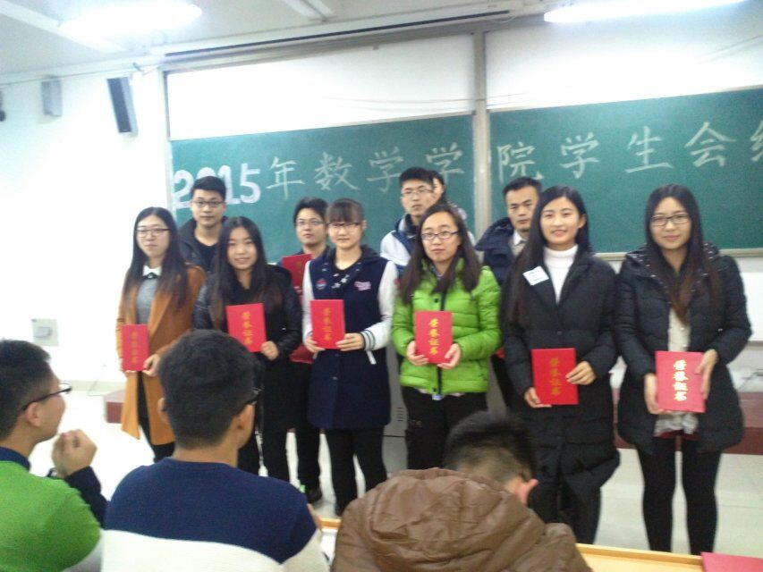 第一个环节,表彰2014届优秀学生干部,并为其颁发荣誉证书,合影留念。他们是:2014届学生会主席赵森、董鹏飞、刘晓阳,秘书部部长王娴,纪检部部长李啸,网络宣传部部长郑程程、部亮,学习部部长陈强、李亚宁,外联部部长唐树媛、生活卫生部部长张丹、后勤部部长刘芙蓉、体育部部长孔德奎。