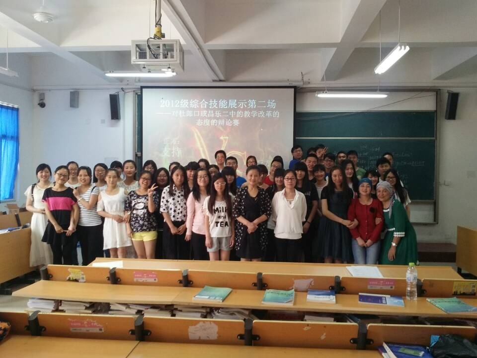 在2012级同学学习《数学教育概论》课程中,针对当今应试教育和素质教育的教学改革,引起了2012级学生们的热烈讨论,并由任课老师李红婷老师,决定展开此次综合技能大赛——对杜郎口或昌乐二中的教育改革态度的辩赛。此次比赛持续两周时间,分为比赛组、评委组、统分组。比赛以小组形式进行两两辩论,双方各二十分钟的自由发言,比赛前期的八个小组由评委的打分晋级四个小组,并根据每组同学的表现确定最佳辩手。比赛后期,四支队伍提前抽签决定正反方,准备时间为一周。