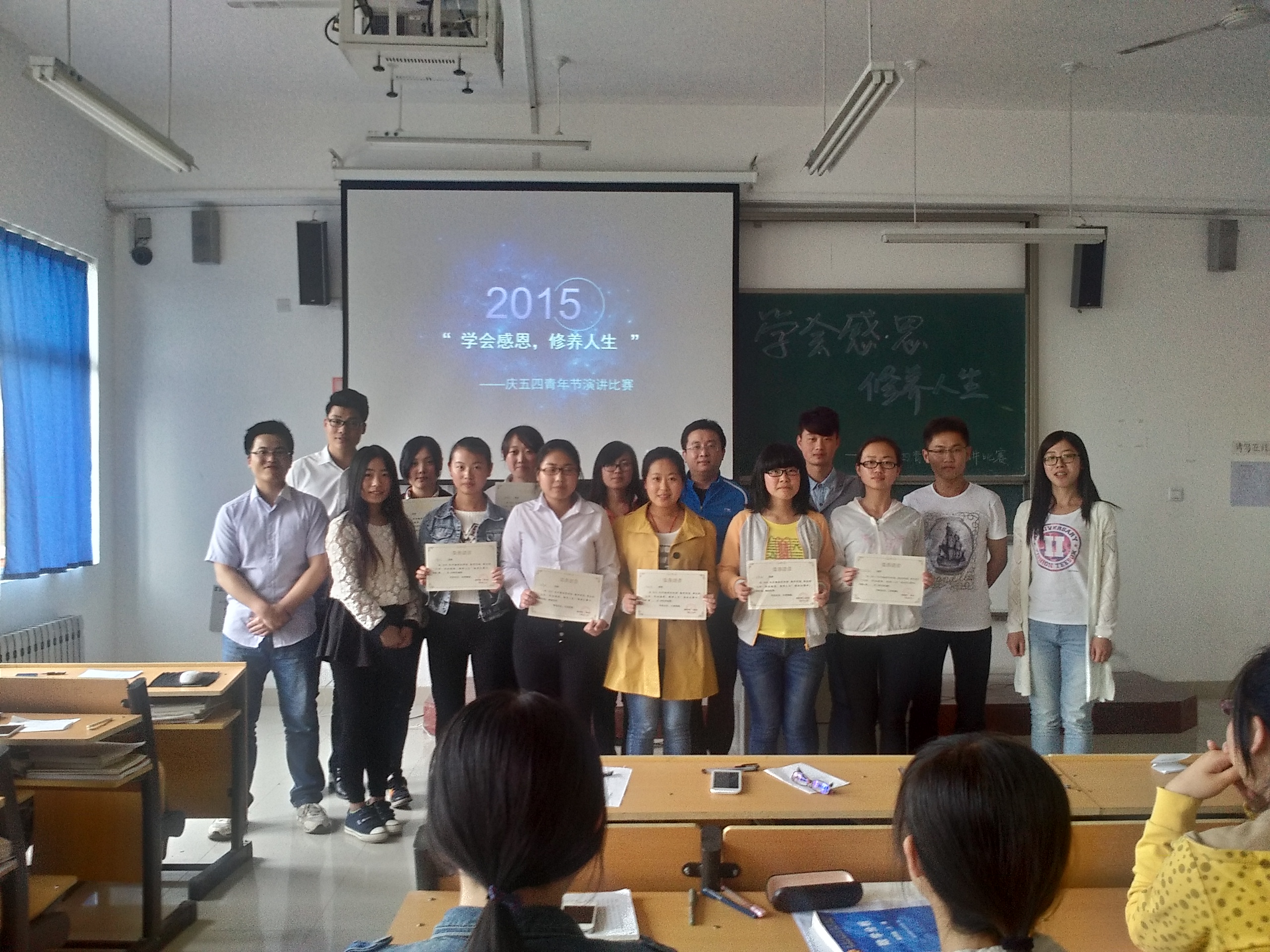 为倡导广大青年大学生传承五四精神,树立远大理想,弘扬爱国主义情怀。2015年5月7日15:30在二教a309举行“学会感恩,修养人生”五四青年节演讲大赛。担任本次大赛评委的有班主任岳书记以及大二大三的学生代表。参赛选手都敢于挑战、充满了热情!
