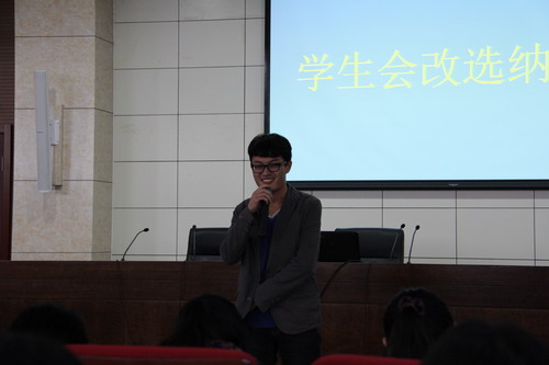 上午八时三十分,在房颜老师简要发言后,学生会成员进行改选演讲,参选的选手们总结了自己一年的工作经验,表达了自己更好为同学服务的决心,评委老师根据其演讲及一年的工作情况综合考虑,择优录取。下午一时,11级新生进行竞选,每位参选新生都要填写个人简历,上台演讲,评委对其进行提问。参选者都做了积极的准备,把自己最好的一面展现给各位评委。 改选纳新工作给更多有才能的同学提供了一个展示自我的平台,为学生会注入了新鲜血液,为更好的给同学们服务奠定了基础。数学系学生会改选纳新圆满结束。