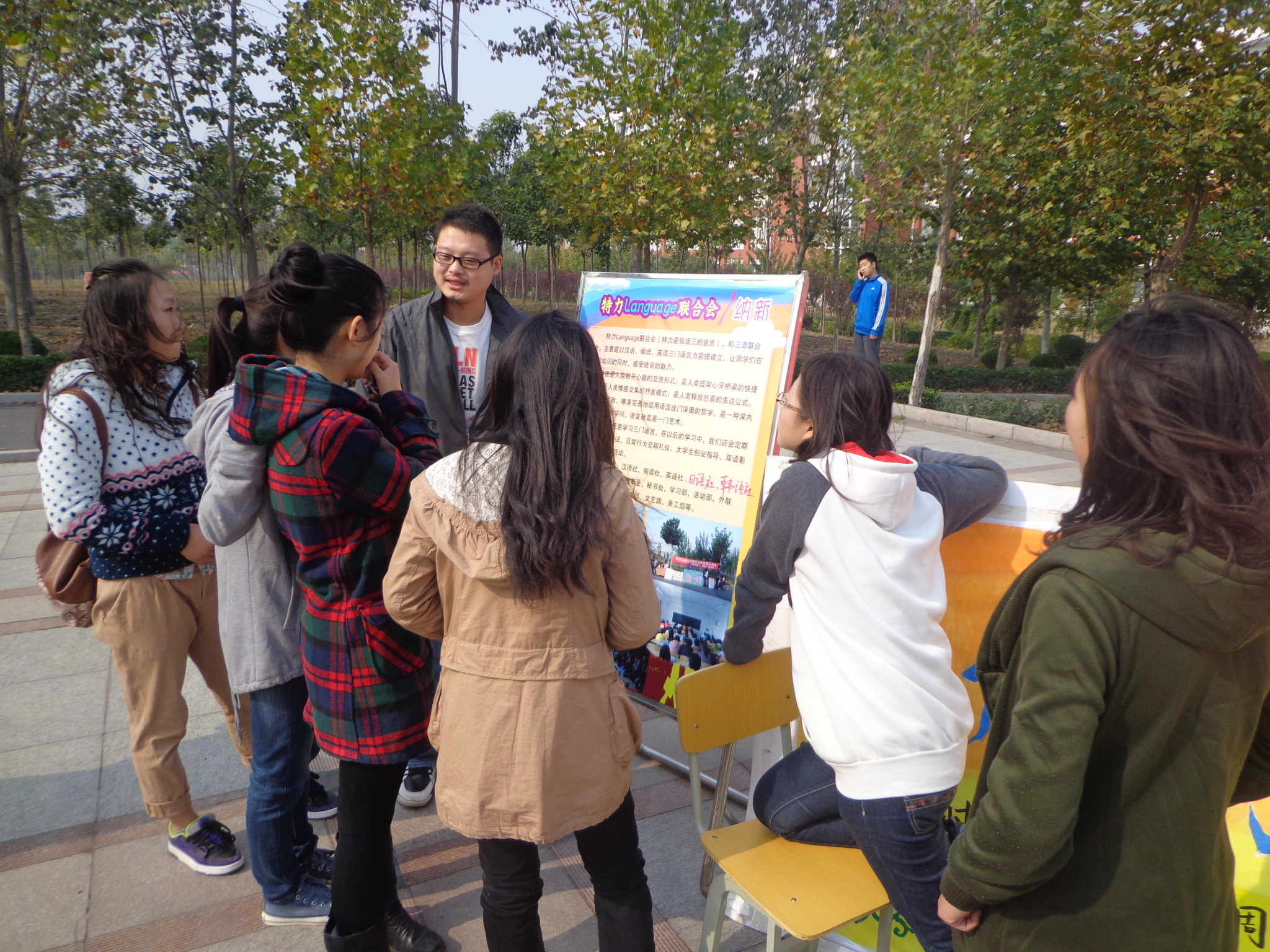 为了为新生提供一个更多的的历练平台,也为了保证我系社团——特力language联合会,有源源不断的新生力量的加入,由学院组织全院社团,统一于2013年10月27日在图书馆北门广场进行了社团纳新活动。