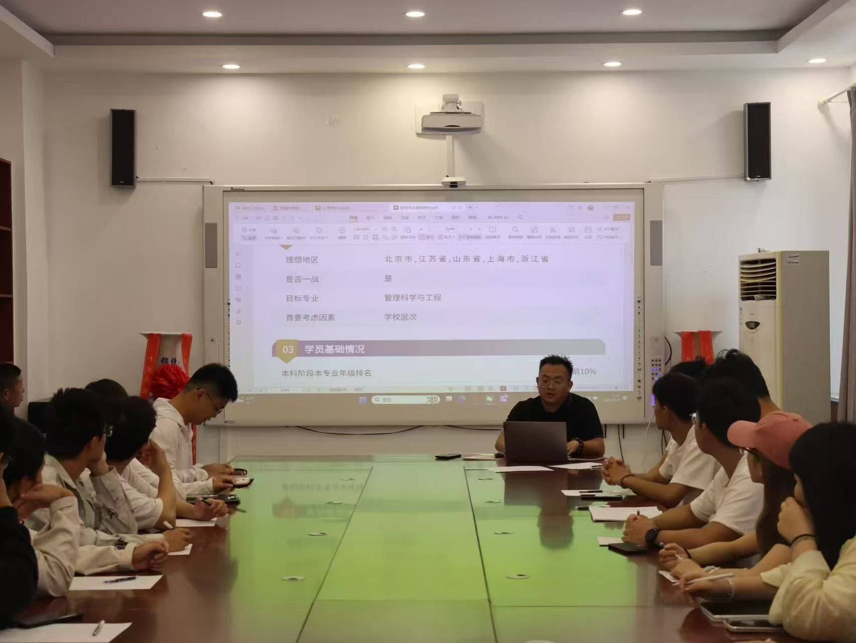 活动伊始,吴培睿以考研的意义为切入点,用深入浅出的方式阐述了考研对个人成长、职业发展及学术追求的重要价值。随后,他以2022级学生为例,借助数据分析,直观展示了“按分择校”的核心逻辑。他提出应建立“分数—院校—专业”精准匹配的模型,建议考生通过模拟测试确定“预期分数区间”,并结合院校历年录取分数、专业实力等多项数据,做出合理选择,为考研冲刺明确方向。